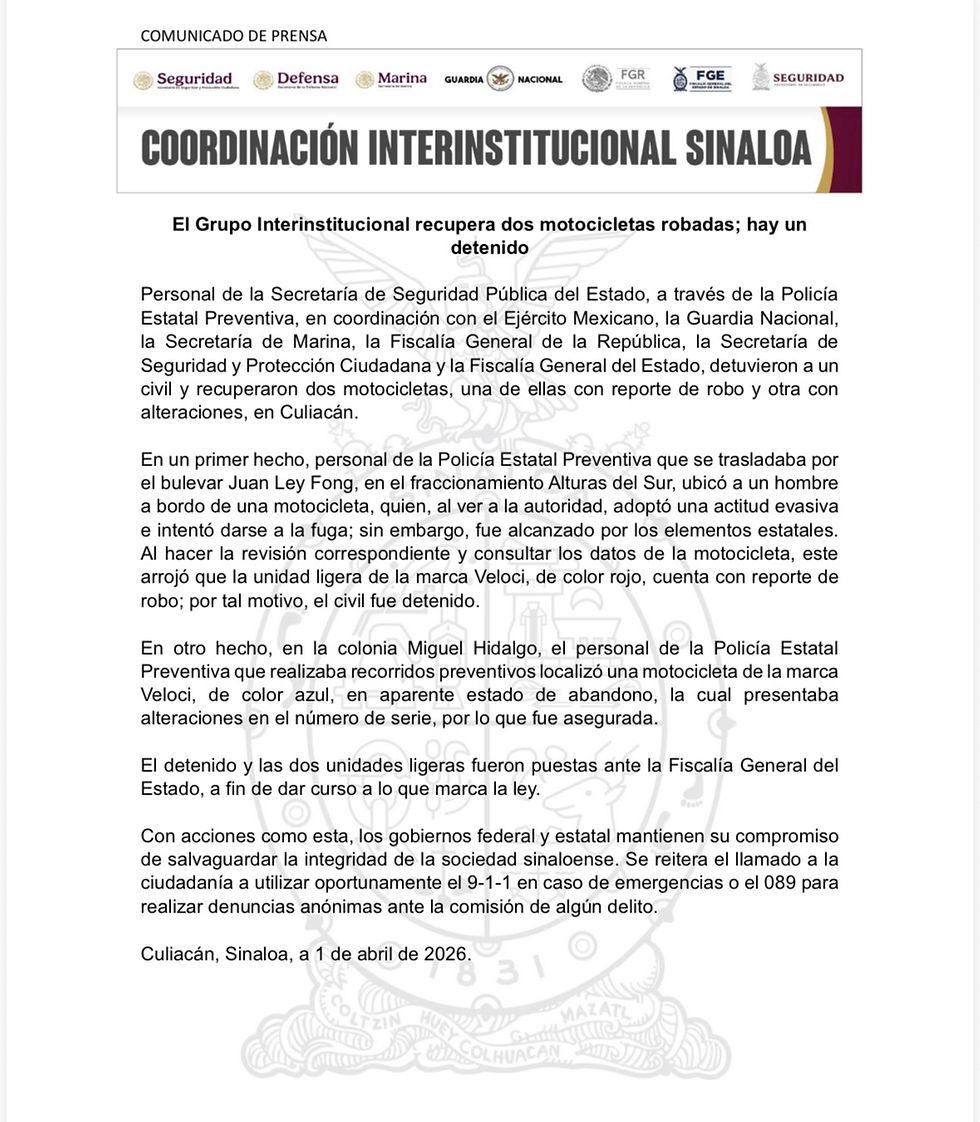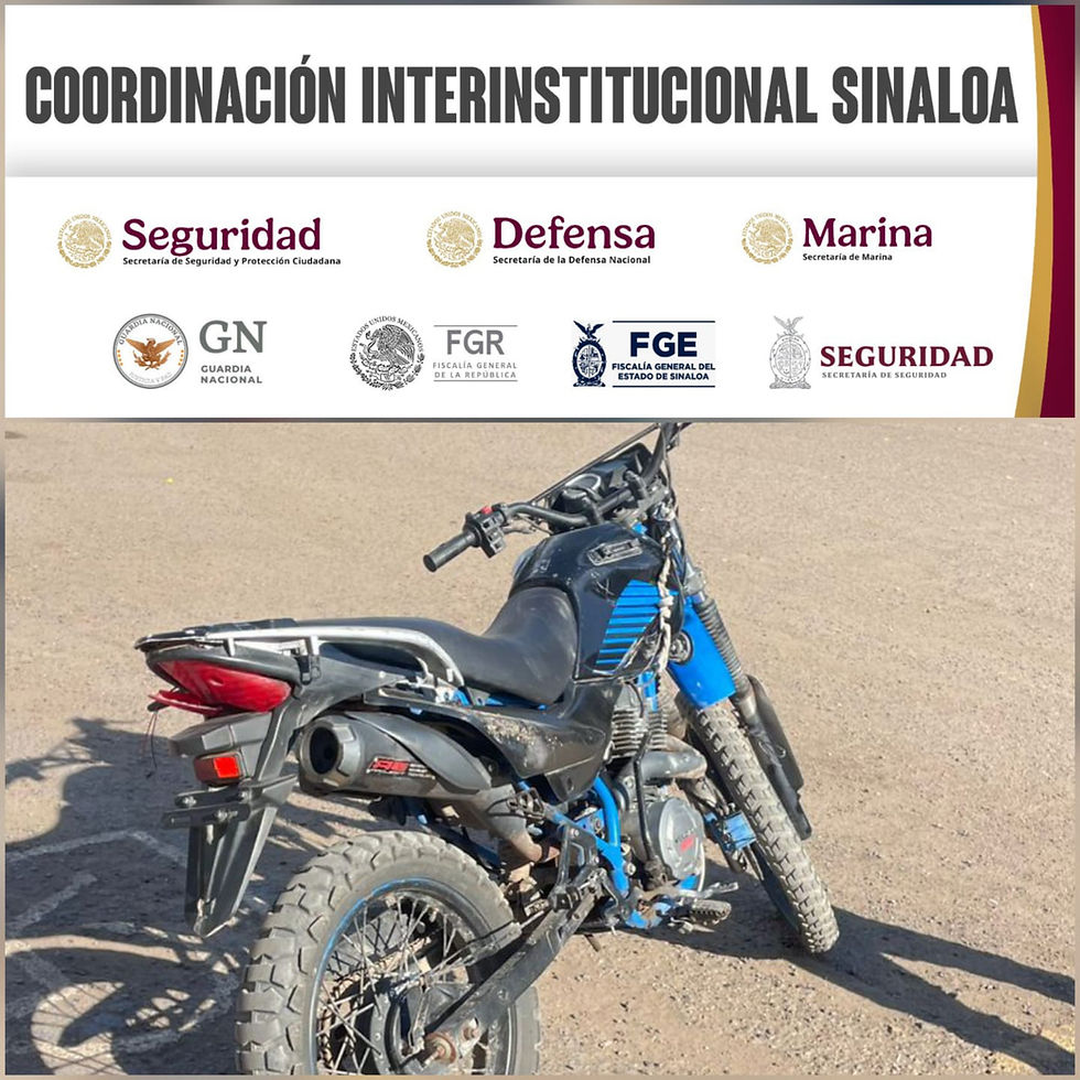 Personal de la Secretaría de Seguridad Pública del Estado, a través de la Policía Estatal Preventiva, en coordinación con el Ejército Mexicano, la Guardia Nacional, la Secretaría de Marina, la Fiscalía General de la República, la Secretaría de Seguridad y Protección Ciudadana y la Fiscalía General del Estado, detuvieron a un civil y recuperaron dos motocicletas, una de ellas con reporte de robo y otra con alteraciones, en Culiacán.