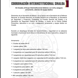 Elementos de la Secretaría de Marina, con el apoyo de la Secretaría de la Defensa Nacional, la Guardia Nacional, la Fiscalía General de la República, la Secretaría de Seguridad y Protección Ciudadana, la Fiscalía General del Estado y la Secretaría de Seguridad Pública de Sinaloa, a través de la Policía Estatal Preventiva, detuvieron a un civil y aseguraron armamento y equipo táctico en Cosalá.