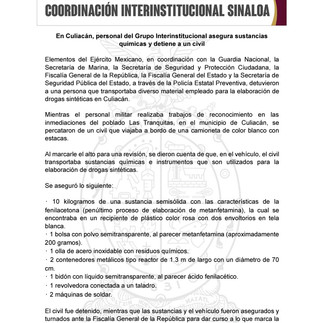 Elementos del Ejército Mexicano, en coordinación con la Guardia Nacional, la Secretaría de Marina, la Secretaría de Seguridad y Protección Ciudadana, la Fiscalía General de la República, la Fiscalía General del Estado y la Secretaría de Seguridad Pública del Estado, a través de la Policía Estatal Preventiva, detuvieron a una persona que transportaba diverso material empleado para la elaboración de drogas sintéticas en Culiacán.