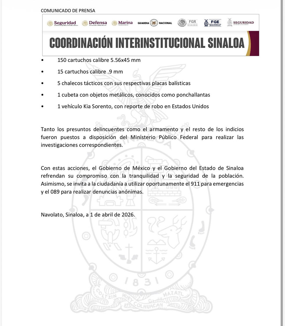 Con estas acciones, el Gobierno de México y el Gobierno del Estado de Sinaloa refrendan su compromiso con la tranquilidad y la seguridad de la población. Asimismo, se invita a la ciudadanía a utilizar oportunamente el 911 para emergencias y el 089 para realizar denuncias anónimas.