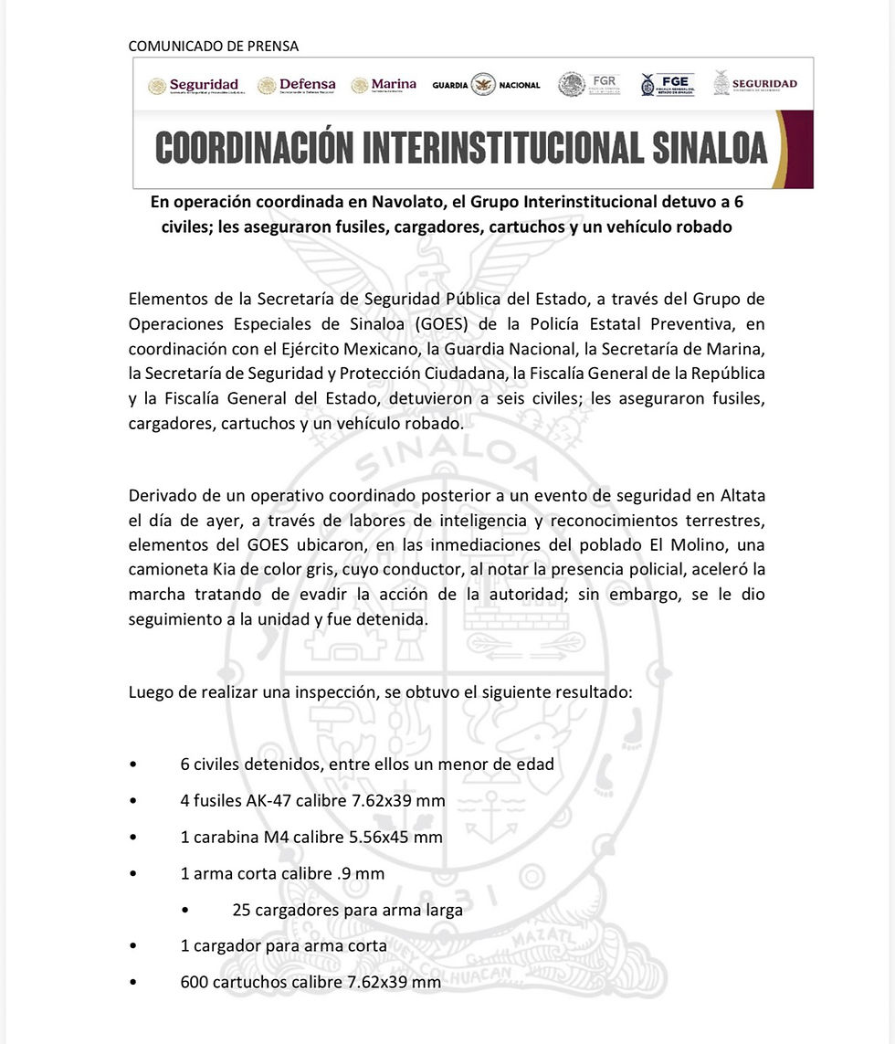 Elementos de la Secretaría de Seguridad Pública del Estado, a través del Grupo de Operaciones Especiales de Sinaloa (GOES) de la Policía Estatal Preventiva, en coordinación con el Ejército Mexicano, la Guardia Nacional, la Secretaría de Marina, la Secretaría de Seguridad y Protección Ciudadana, la Fiscalía General de la República y la Fiscalía General del Estado, detuvieron a seis civiles; les aseguraron fusiles, cargadores, cartuchos y un vehículo robado.