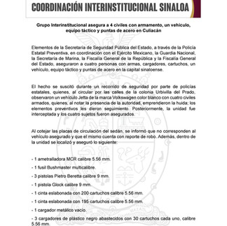 Elementos de la Secretaría de Seguridad Pública del Estado, a través de la Policía Estatal Preventiva, en coordinación con el Ejército Mexicano, la Guardia Nacional, la Secretaría de Marina, la Fiscalía General de la República y la Fiscalía General del Estado, aseguraron a cuatro personas con armas, cargadores, cartuchos, un vehículo, equipo táctico y puntas de acero en la capital sinaloense.