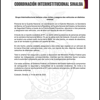 Con estas acciones, el Gobierno Federal y el Gobierno del Estado reafirma su compromiso de salvaguardar la seguridad y tranquilidad de la sociedad sinaloense. Se invita a la ciudadanía a marcar oportunamente al 911 para cualquier emergencia y al 089 para realizar denuncias anónimas.