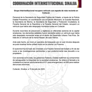Personal de la Secretaría de Seguridad Pública del Estado, a través de la Policía Estatal Preventiva, en coordinación con el Ejército Mexicano, la Guardia Nacional, la Secretaría de Marina, la Secretaría de Seguridad y Protección Ciudadana, la Fiscalía General de la República y la Fiscalía General del Estado, recuperó un vehículo que había sido despojado momentos antes en Culiacán.