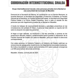 Personal de la Secretaría de Marina, en coordinación con el Ejército Mexicano, la Guardia Nacional, la Secretaría de Seguridad y Protección Ciudadana, la Fiscalía General de la República, la Fiscalía General del Estado, la Secretaría de Seguridad Pública Estatal y la Policía Estatal Preventiva, llevó a cabo el rescate de dos personas que eran ilegalmente privadas de su libertad en Mazatlán.