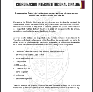 Elementos del Ejército Mexicano, en coordinación con la Guardia Nacional, la Secretaría de Marina, la Secretaría de Seguridad Pública y Protección Ciudadana, la Fiscalía General de la República, la Fiscalía General del Estado y la Secretaría de Seguridad Pública Estatal, llevaron a cabo el aseguramiento de armas, cargadores, equipo táctico y demás objetos de delito.