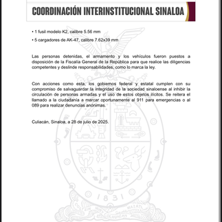 Con acciones como esta, los gobiernos federal y estatal cumplen con su compromiso de salvaguardar la integridad de la sociedad sinaloense al inhibir la circulación de personas armadas y el uso de estos objetos ilícitos. Se reitera el llamado a la ciudadanía a marcar oportunamente al 911 para emergencias o al 089 para realizar denuncias anónimas.